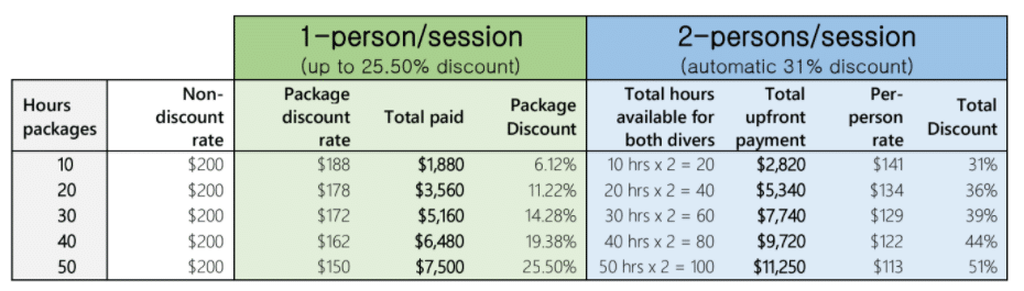 Bulk package purchases: We require payment in full of for all bulk-hour package purchases prior to the first session. Bulk package pricing offers client-patients a discounted per-hour session rate based on the total number of hours purchased, in accordance with our current pricing schedule (see https://hope-connection.com/prices.pdf). In general, client-patients may purchase session packages in 10-hour increments to receive discounted per-hour pricing; package pricing enables us to provide affordable hyperbaric oxygen therapy pricing to our client-patients.
